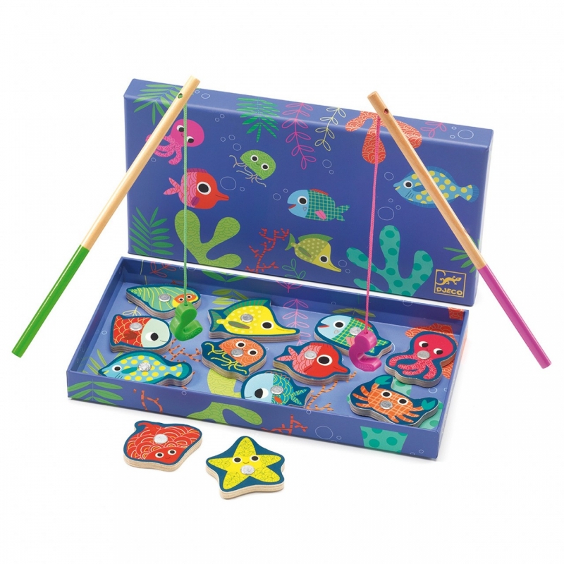 Sunteți gata să pescuiți? Acest set include peștișori din lemn, 2 undițe de pescuit și o cutie care se transformă în apa mării. Copiii folosesc undițele pentru a prinde piesele magnetice din lemn. Excursia la pescuit poate începe! Pescuieşte cele 12 vietăți din mare, şi cine ştie, poate vreun peştişor îți va îndeplini o dorință. Joc de coordonare. Ajută la dezvoltarea motricităţii fine, a coordonării ochi-mână. Jocul conține 12 vieţuitoare marine (lemn și metal), 2 undițe (lemn, plastic, magnet), 1 cutie decorativă. Pentru pescarii mici în vârstă de 2 ani. Joc de coordonare. Ajută la dezvoltarea observației, a motricităţii fine, a coordonării ochi-mână. Confecționat din lemn, cu vopsele non-toxice, conform reglementărilor EN71&ASTM. AVERTISMENT: Acest joc conține magneți. Magneții se lipesc unul de altul sau de un obiect metalic; în interiorul corpului uman pot provoca accidente. Cereți imediat asistența medicului în caz de înghițire. Contraindicat copiilor mai mici de 2 ani. A se folosi sub directa supraveghere a unei persoane adulte. Producător: Djeco, Franţa.
