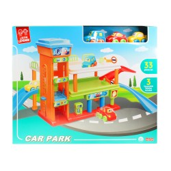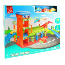 Setul include 33 piese: 3 masinute, rampe, parcari supraetajate, benzinarie, spalatorie auto etc.