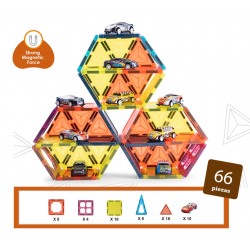 - 66 de piese in total: 56 piese magnetice din plastic durabil cu magnet integrat si 10 masinute simpatice, usor de manevrat de catre copii